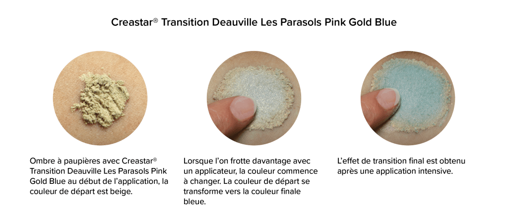 Nos nuances nacrées Creastar® Deauville 1916 apportent une nouvelle texture d’une extrême douceur et une excellente adhérence à la peau. Ces propriétés sont dues à leur composition unique.